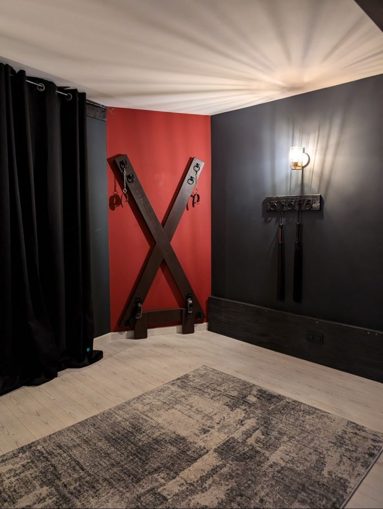Le Donjon du Repaire Des Passions est équipé d'une croix de Saint-André, d'un pilori, d'une cage et de divers accessoires.